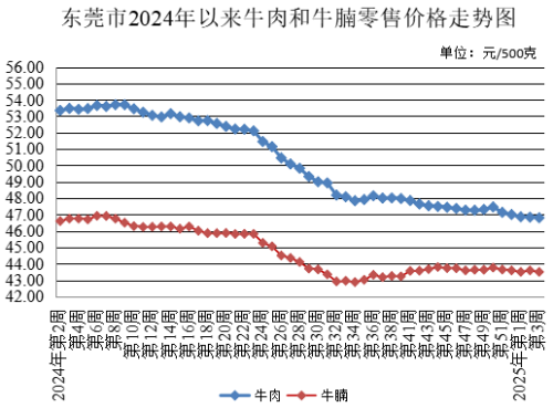 第3周,牛肉農貿市場零售均價為每500克46.80元,較上周下降0.09%。牛腩農貿市場零售均價為每500克43.50元,較上周下降0.21%。雞肉農貿市場零售均價為每500克17.27元,較上周下降0.69%。
